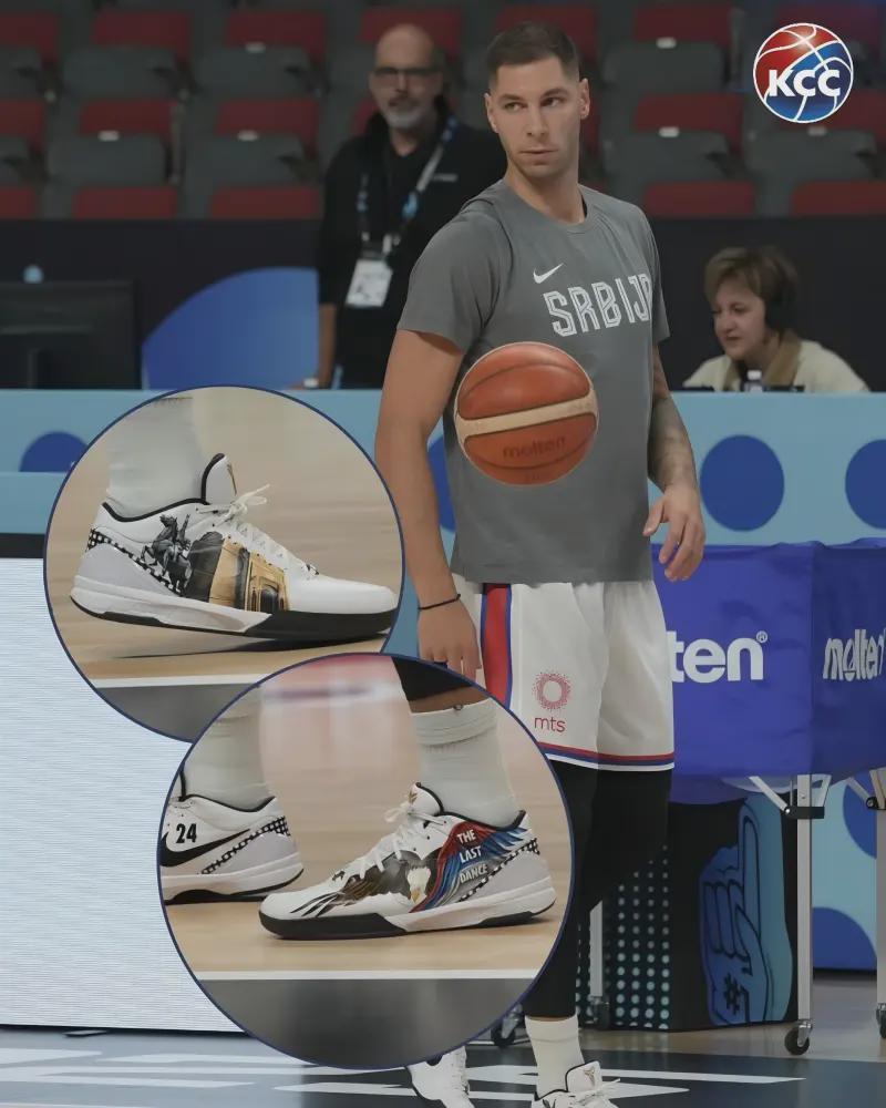 比赛结束后,塞尔维亚男篮官方社媒晒出了队内老将斯特凡·约维奇上脚的一双科比4球鞋。可以看到,鞋面上印有一只雄鹰,其翅膀为塞尔维亚国旗标志性的红白蓝三色,写着“最后一舞(The Last Dance)”的字样。另一球鞋上则疑似印有塞尔维亚的标志性建筑米哈伊洛王子骑马雕像。